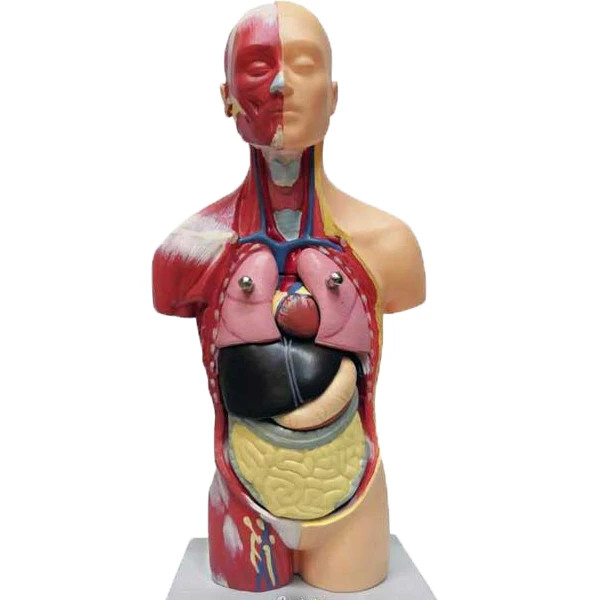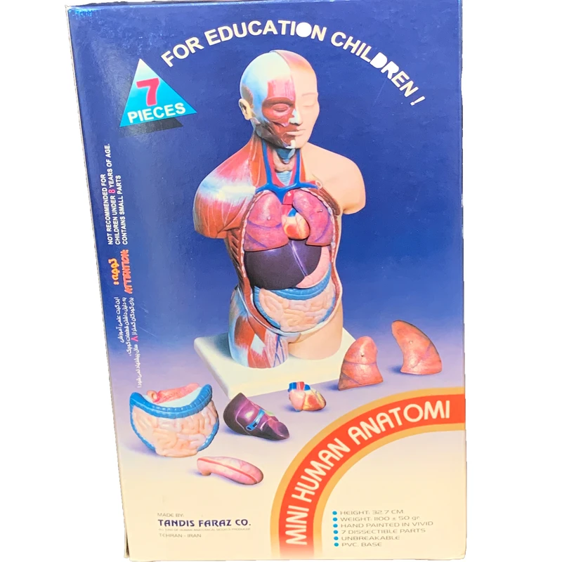 این مدل یک وسیله جذاب ومفید کمک آموزشی وسرگرمی است که برای آموزش آناتومی بدن انسان سر،گردن ونیم تنه فوقانی مناسب است.این مدل ازجنس pvcنشکن وفاقدماده سرطانزای آزبست است ورنگهای به کاررفته بدون سرب وکاملا بی ضرر ومقاوم است که جزئیات اندام ها منطبق باواقعیت روی آن نقاشی حرفه ای شده است که ازویژگیهای منحصربفرداین مدل توجه به ریزه کاری هابادقت بالای علمی میباشددارای 7قطعه است که به راحتی تفکیک وجاگذاری می شوند: شش راست و چپ ( دوقطعه)، قلب (دوقطعه)، کبد، معده، روده کوچک و بزرگ و پانکراس( یک قطعه) و بدنه مدل در ناحیه گردن غضروف حنجره وغده تیروئید و نای مشاهده می شوند و نیز ماهیچه های صورت و تنه و ران در نیمه راست دیده می شوند. این مدل مناسب هدیه به دانش آموزان کنجکاووخلاق ،مطب های پزشکان،آزمایشگاه ها،مدارس وکلیه علاقه مندان به ساختاربدن انسان میباشد.